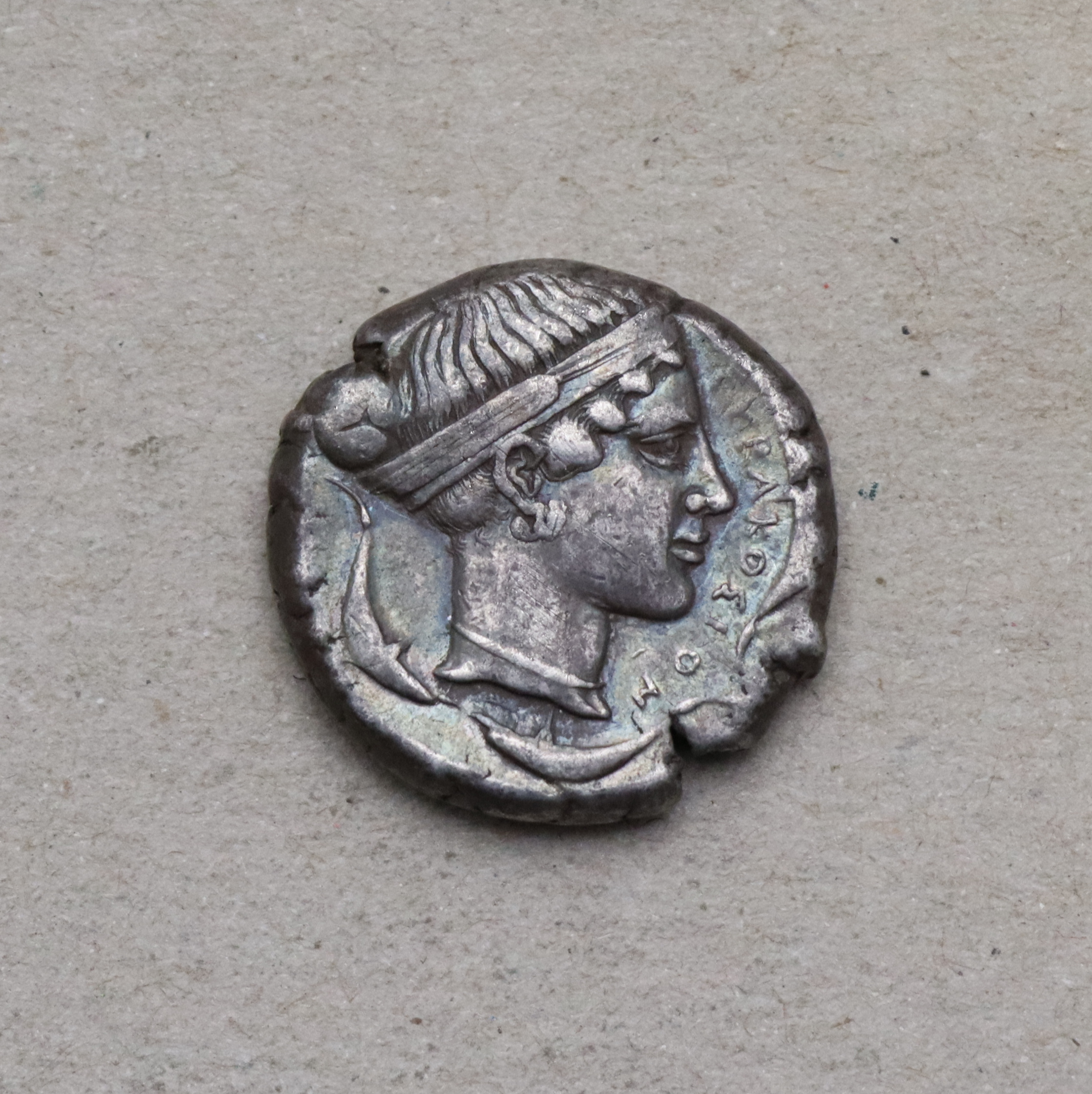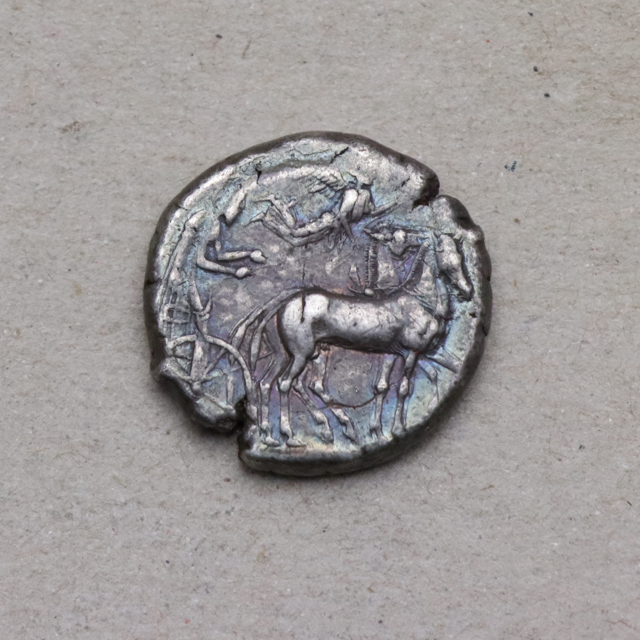 Avers - nymfa Arethusa obklopená delfíny, revers - vítězná kvadriga (vozataj, Niké). Syrakusy byly nejmocnější řeckou kolonií na Sicílii, to se odráželo v kvalitě a oběhu jejich mincí.